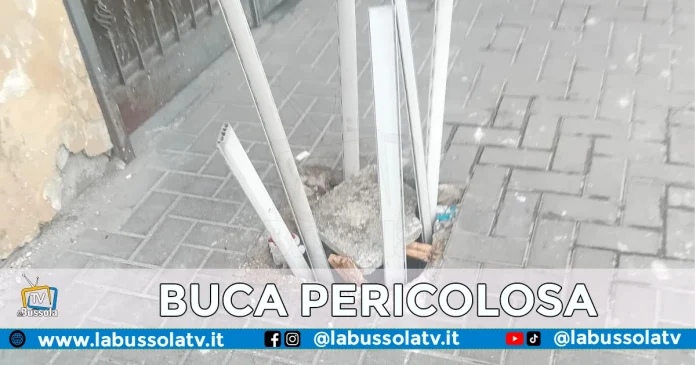 In via Chiacchio, da diversi giorni, si è aperta una pericolosa buca sul marciapiede a causa pare della rottura di un tombino. Si tratta di un marciapiede molto “trafficato” usato sia per raggiungere l’Istituto scolastico Torricelli, ma anche il cimitero comunale.