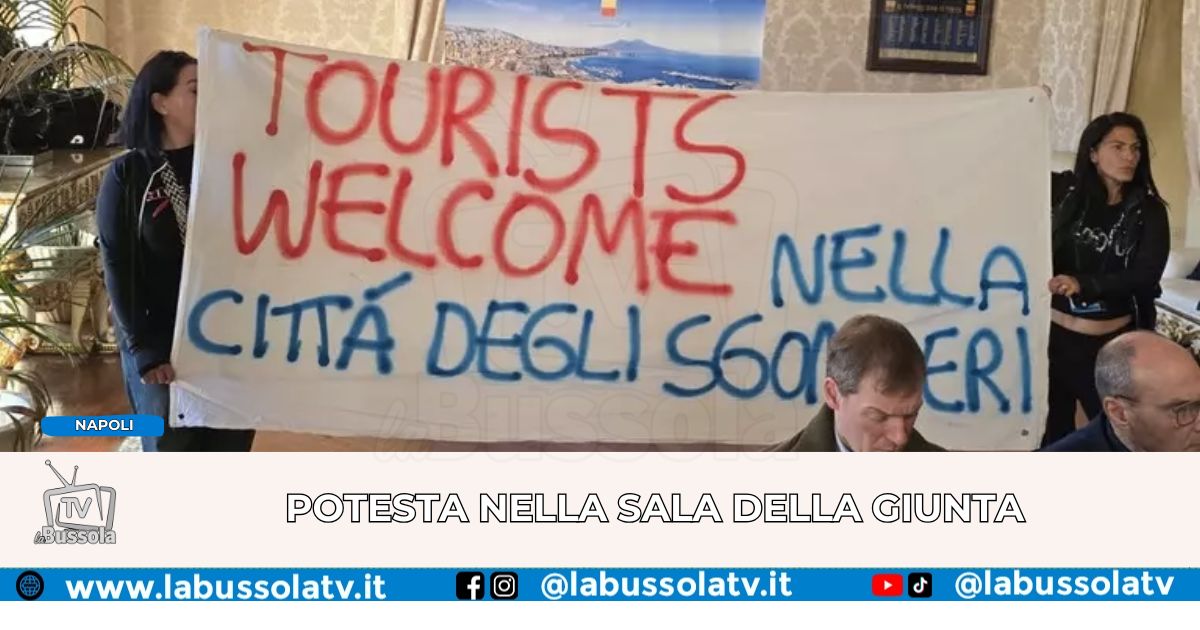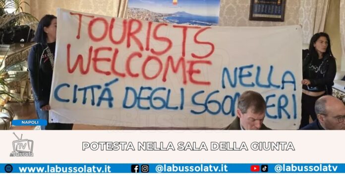 ‘Tourist welcome, nella città degli sgomberi’. E’ lo striscione che due donne stanno esponendo nella sala giunta del Comune di Napoli, mentre è in corso la conferenza stampa per la presentazione del bilancio sociale. le donne rappresentano le famiglie che il prossimo 8 ottobre saranno sgomberate dell’ex motel Agip.