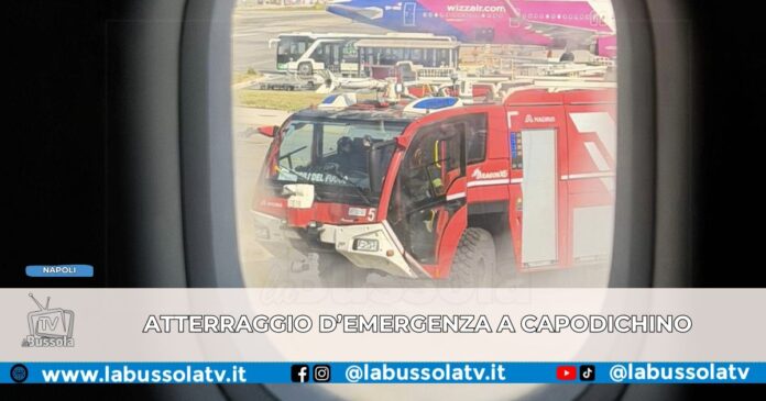 Intervento dei vigili del fuoco dopo l’atterraggio di sicurezza a Napoli di un aereo proveniente da Sharm el-Sheikh, in Egitto, e diretto a Roma, a causa della fuoriuscita di fumo proveniente dalla stiva.