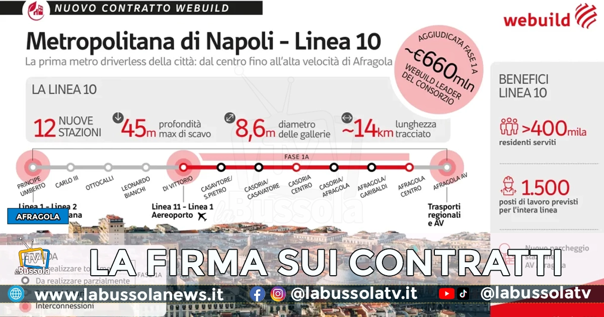 AFRAGOLA – Lunedì 4 maggio, alle 15 nella Sala Giunta di Palazzo San Giacomo, alla presenza del sindaco di Napoli, Gaetano Manfredi, del vicepresidente della Regione Campania Mario Casillo, e dell’assessore comunale alle Infrastrutture e ai Trasporti Edoardo Cosenza, si procederà alla firma del contratto per la realizzazione del secondo lotto, afferente agli impianti tecnologici ed ai treni, per la Linea 10 Afragola-Napoli.